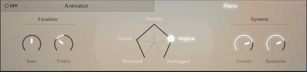 Nach dem Start erscheint die „Piano Section“. Sie bietet Zugriff auf die wichtigsten Klang-Parameter. Hier gibt es einen kräftig zupackenden Equalizer für Bass und Höhen und die Dynamik-Kontrolle, mit der sich der Dynamikbereich einschränken lässt. Mit einem Regler kann man die Lautstärke des anschlagabhängigen „Crunch“-Anteils bestimmen. In der Mitte des Bedienfelds erscheint ein besonders interessantes Element, der „Pentamorph“ Fader.