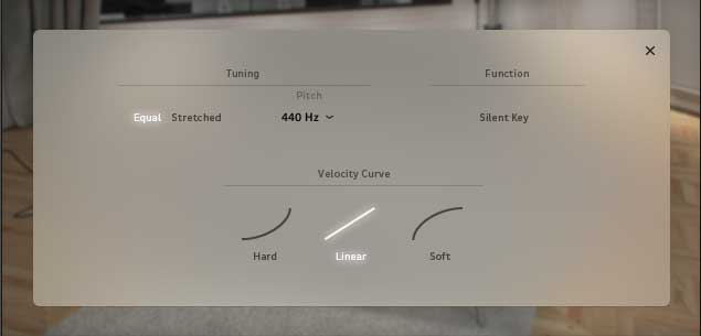 Ein kleines Zahnrad führt zum Pop-up mit den globalen Einstellungen für Stimmung und Anschlagdynamik.