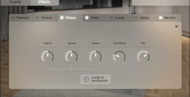 Der Tonality Pop-up Dialog enthält die Parameter-Einstellungen, die den Sound am meisten beeinflussen. Die Lautstärke der Resonanztöne bei gedrücktem Haltepedal lässt sich ebenso regeln, wie die Intensität von Nebengeräuschen. Der Abstand der klangerzeugenden „Tines“ von den Tonabnehmern kann verändert werden und damit der glockenartige Anteil am Sound. Die in Attack und Decay regelbaren Hüllkurven und die Möglichkeit, bei entsprechender Einstellung des Pentamorph Faders rückwärts ablaufende Samples beizumischen, machen aus dem Piano schon fast einen Synthesizer. Hier wird die Grenze von der Klangregelung zum Sound-Design überschritten. EDM-Musiker und Filmkomponisten werden das sicher besonders zu schätzen wissen.