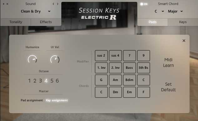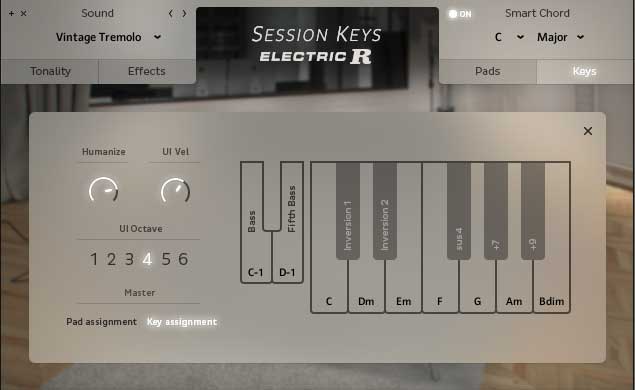 Wie bei den anderen SESSION Instrumenten von e instruments (und nicht nur bei diesen) gibt es eine Smart-Chord Funktion. Hier lassen sich Akkorde einer ausgewählten Tonart (Dur, Moll, Dominant 7, Dorisch) mit jeweils einer weißen Taste des virtuellen 1-Oktav-Keyboards oder des angeschlossenen MIDI-Keyboards triggern. Zusätzlich gedrückte schwarze Tasten bewirken Akkord-Umkehrungen oder Erweiterungen (sus4. +7, +9). Links neben dem virtuellen Keyboard sind zwei weitere Tasten abgebildet, die den MIDI-Noten C-1 und D-1 auf der externen Tastatur entsprechen. Wenn eine davon aktiv ist, wird dem jeweiligen Akkord ein weiterer Grundton oder eine Quinte im Bassbereich hinzugefügt.