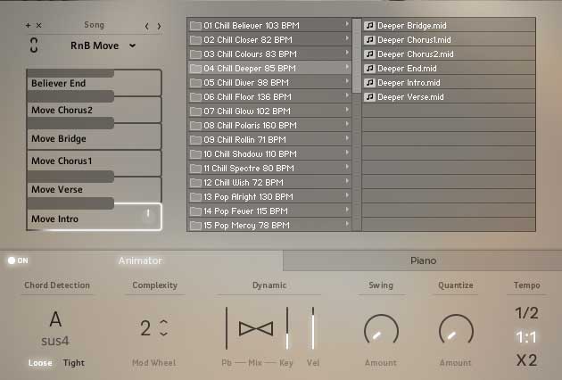 Die Animator-Phrasen können aber nicht nur umgeschaltet, sondern auch während des Spiels beeinflusst werden. Mit dem Modulation Wheel lässt sich in drei Stufen ihre Komplexität bestimmen. Das Pitch Wheel kann alternativ oder zusätzlich zum Tastenanschlag die Anschlagstärke steuern. Ein Swing-Parameter ist ebenso vorhanden, wie eine Umschaltung des relativen Tempos der Darbietung auf halbe oder doppelte Geschwindigkeit.
