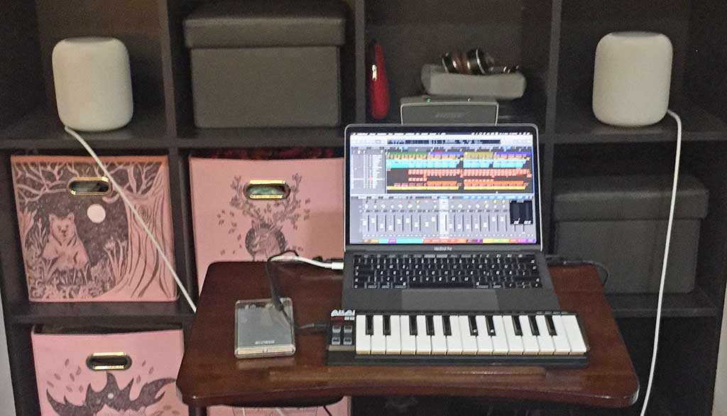 Zum Abhören dienten der Kopfhörer Beyerdynamik Aventho Wireless und der Lautsprecher Bose SounLink mit Kabelanschluss. Beide sind über dem Monitor im Regal zu sehen. Die beiden HomePods konnte ich zur Mix-Kontrolle einsetzen, zum Einspielen sind drahtlose Geräte wegen der Latenz aber ungeeignet.