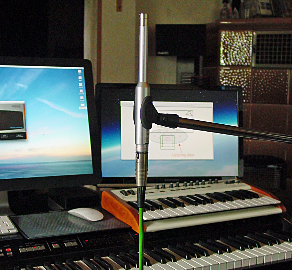 Meine Haupt-Abhöranlage besteht aus aktiven Monitorboxen JBL LSR 43028 P. Außerdem besitze ich eine “Consumer-Anlage” mit Lautsprecherboxen und einem Subwoofer von Teufel, verstärkt von einem Denon Receiver. Die JBL-Boxen stehen an der Schmalseite, die Teufelboxen an der Längsseite des Raums, deshalb ergeben sich schon durch die Aufstellung unterschiedliche akustische Bedingungen. Beide Anlagen haben eigene Einmess-Systeme an Bord und werden mit passendem Mikrofon ausgeliefert. JBL nennt das hauseigene System R.M.C, das bedeutet Room Mode Correction, damit werden nur Bassfrequenzen korrigiert. Im Denon Receiver ist ein Audyssey-System eingebaut, das auf Surroundbetrieb optimiert ist.
