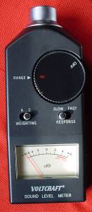 Messtöne von einer CD (Rauschen, das abwechselnd aus den Lautsprechern tönt) dienten als Signal. Ich konnte dabei beobachten, wie sich beim Subwoofer stehende Wellen “aufschaukeln”. Obwohl der Messton gleichmäßig erklingt, schwingt die Nadel in kurzen Abständen weiter nach rechts und die Anzeige erhöht sich um mehrere dB.