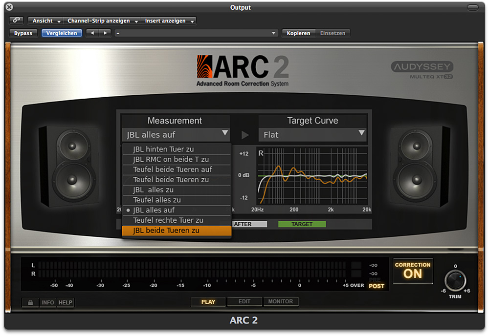 Im Plug-in-Fenster lässt sich über ein Pulldown-Menü eines der gespeicherten Messprofile laden. Die Grafik zeigt in einem Koordinatensystem drei Frequenzgangkurven, jeweils für den linken und den rechten Kanal. Der Zielfrequenzgang wird grün durch eine Gerade dargestellt, der nicht korrigierte, gemessene Frequenzgang ist orange und das Ergebnis der Korrektur wird durch eine weiße Linie angezeigt.