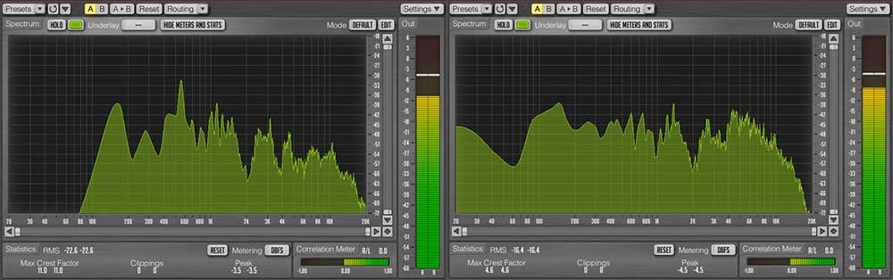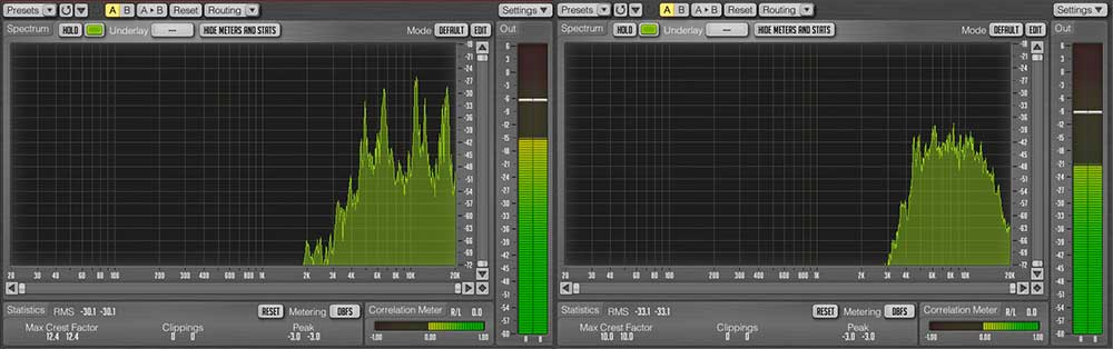 Die Grafik des Analysers zeigt deutliche den Unterschied im Frequenzgang bei 30cm Abstand und Nahbesprechung. Ich weise darauf hin, dass diese Messungen nichts mit den Messungen zu tun haben, wie sie Fachzeitschriften oft durchführen, wenn die Geradlinigkeit eines Frequenzgangs mit Sinustönen überprüft wird. Bei Sprache und Instrumenten müssen „Berge und Täler“ zu sehen sein.