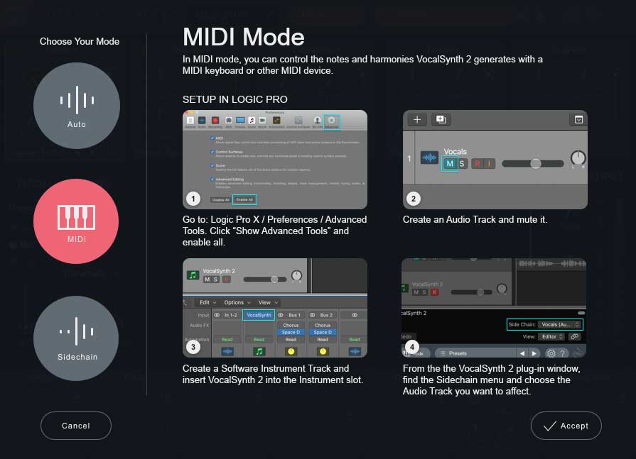 Richtig toll finde ich, dass mit einem Klick auf die Mode-Schaltfläche eine bebilderte Erklärung angezeigt wird, wie VocalSynth 2 in der gerade verwendeten DAW konfiguriert werden muss. Das ist wichtig bei der Verwendung der Sidechain-Funktionen.