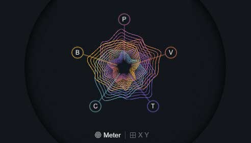 Wenn man auf Anemone View umschaltet, lässt sich der Pegel aller Module mit Anfassern steuern. Die attraktive Grafik in Form einer mehrfarbigen Blüte zeigt die Anfangsbuchstaben der fünf Sound-Prozessoren. Je weiter ein Buchstabe nach außen gezogen wird, desto weiter entfaltet sich das jeweilige Blütenblatt und desto lauter wird der Pegel des jeweiligen Moduls im Mix. Die Bewegungen lassen sich selbstverständlich mit der DAW-Automation aufzeichnen.