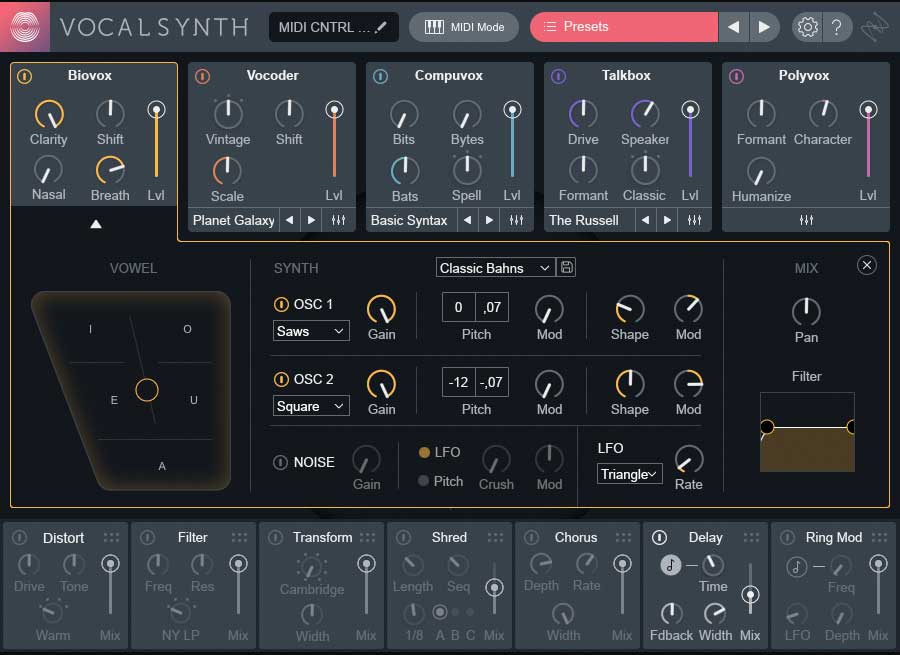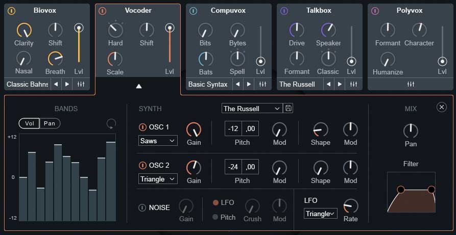 In der einfachen Ansicht dieses Moduls lässt sich die Sprachdeutlichkeit regeln, die Formanten können verschoben werden und der Stimme lässt sich ein nasaler Charakter verleihen. Dreht man „Breath“ auf, wird ein Flüster-Sound erzeugt. In der Ansicht Advanced View lassen sich nicht nur Synthesizer, Panorama und Filter programmieren, sondern mit dem Vowel-Pad kann der Klang der Vokale stufenlos in Richtung A – E – I – O – U verändert werden.
