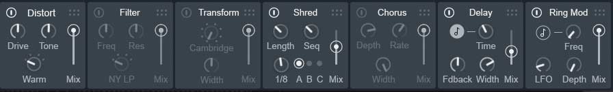 Die Reihenfolge der Effekte lässt sich per Drag and Drop beliebig ändern. Jeder Effekt-Prozessor hat einen Ein/Aus-Schalter und drei oder vier Regler. Neben Standard-Effekten wie Chorus und Delay gibt es Spezialisten. Transform sorgt per Faltungs-Technik für das Modeling von Lautsprecherboxen, Gitarrenverstärkern und anderen Geräten. Es lässt sich ein Effekt wie beim Re-Amping erzielen. Shred schneidet kurze Abschnitte aus einer Audiodatei und wiederholt sie. Der Ring-Modulator erzeugt bei hohen Frequenzeinstellungen metallische Sounds, bei niedrigen lässt sich ein Signal damit rhythmisch zerteilen.